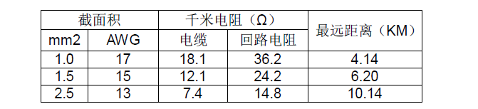 根據(jù)使用屏蔽線纜的技術(shù)參數(shù)可確定檢測(cè)儀的最遠(yuǎn)傳輸距離,見下表: